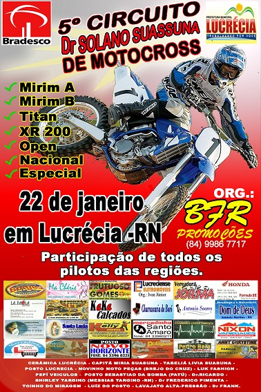 Divulgamos a todos os interessados o 5º Circuito Dr. Solano Suassuna de Motocross que acontecerá no próximo dia 22 de janeiro na cidade de Lucrécia/RN. A organização da prova espera a participação de todos os pilotos amadores e profissionais do RN.